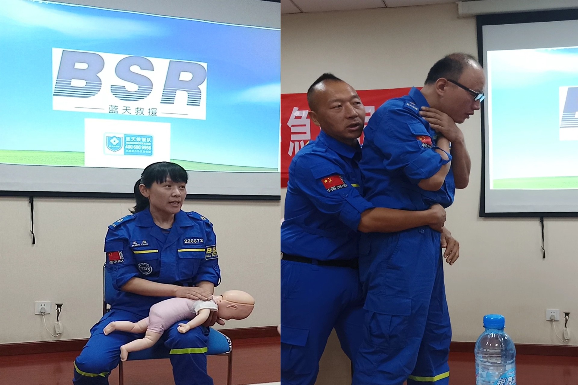 圖為志愿者王超老師為學(xué)員演示孩子氣管被卡的院前緊急處理對策;李華老師與丁亞楠老師為學(xué)員演示成人氣管被卡的院前緊急處理對策。