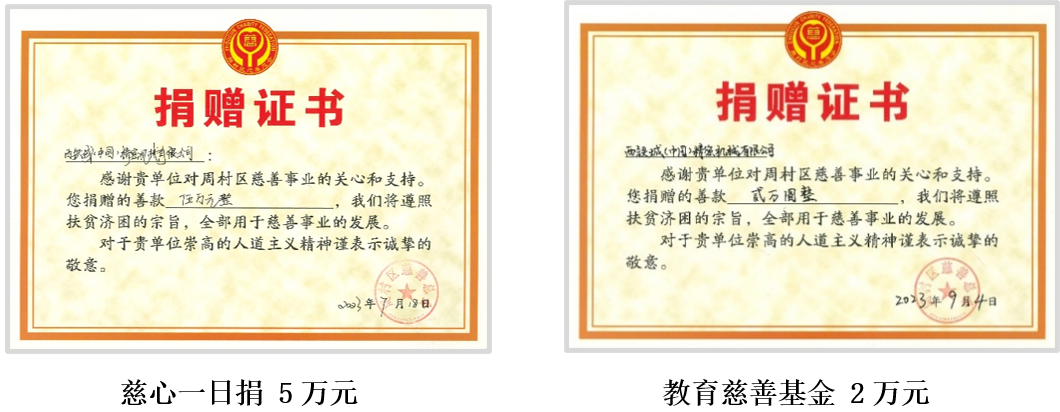 2023年7月份慈心一日捐,公司捐款5萬元,同年9月份再捐款2萬元教育慈善基金,共計捐贈7萬元。提升奉獻意識,弘揚社會正能量,營造了“人人關心慈善、人人支持慈善、人人參與慈善”的良好氛圍。獲得了當地政府的多次好評,并榮獲“尊師重教先進單位”榮譽稱號。